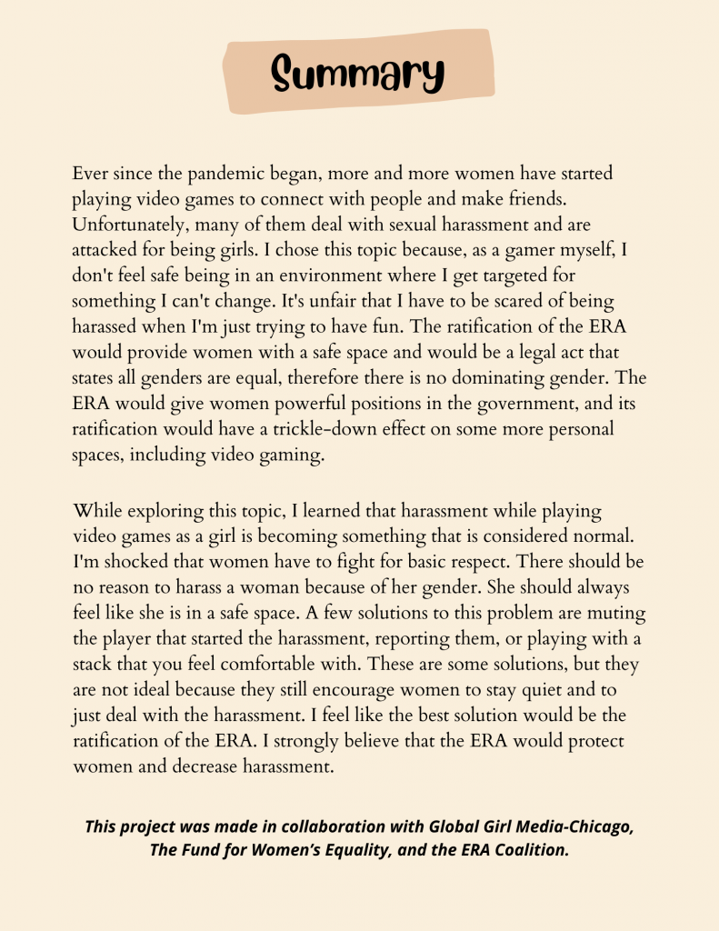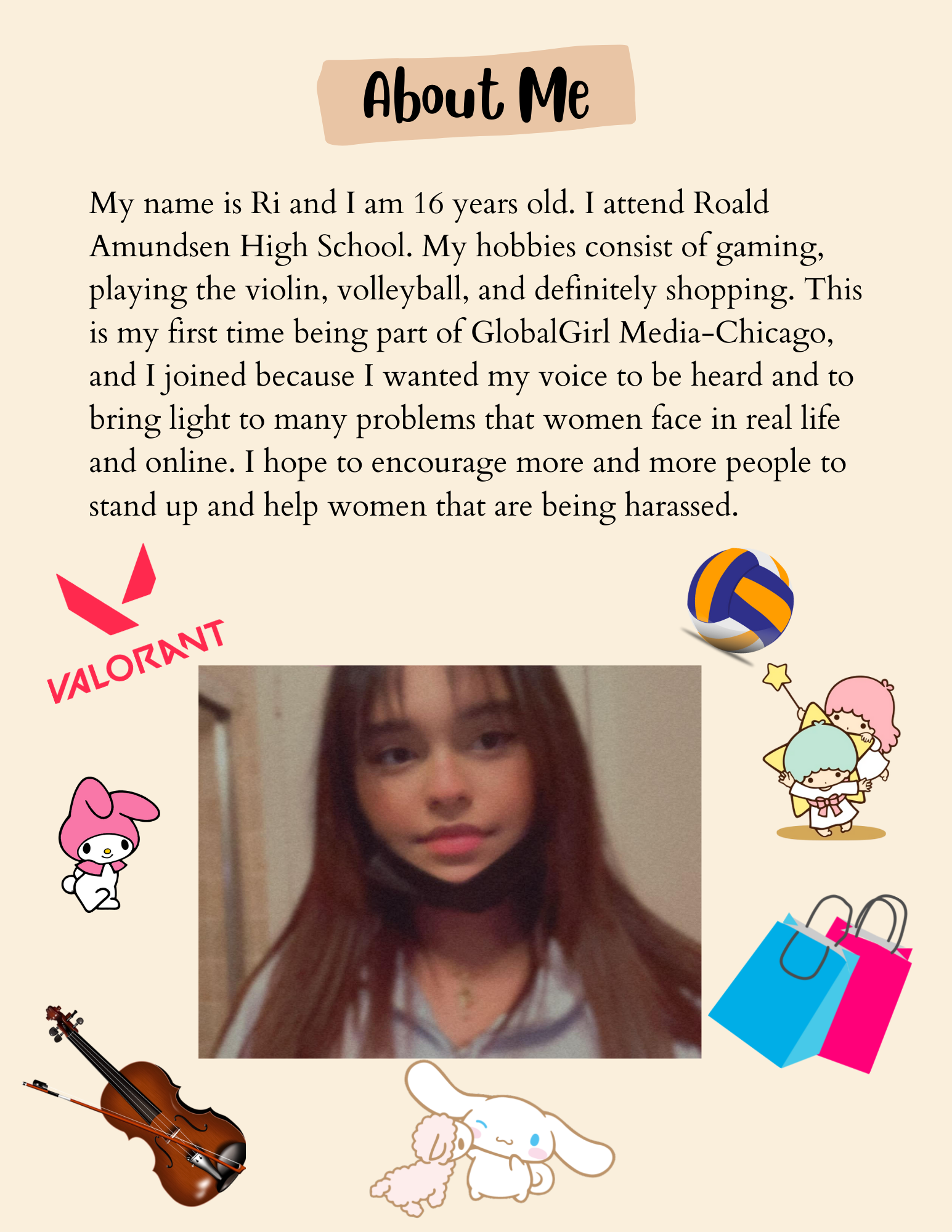 My name is Ri and I am 16 years old. I attend Roald Amundsen High School. My hobbies consist of gaming, playing the violin, volleyball, and definitely shopping. This is my first time being part of GlobalGirl Media-Chicago, and I joined because I wanted my voice to be heard and to bring light to many problems that women face in real life and online. I hope to encourage more and more people to stand up and help women that are being harassed.