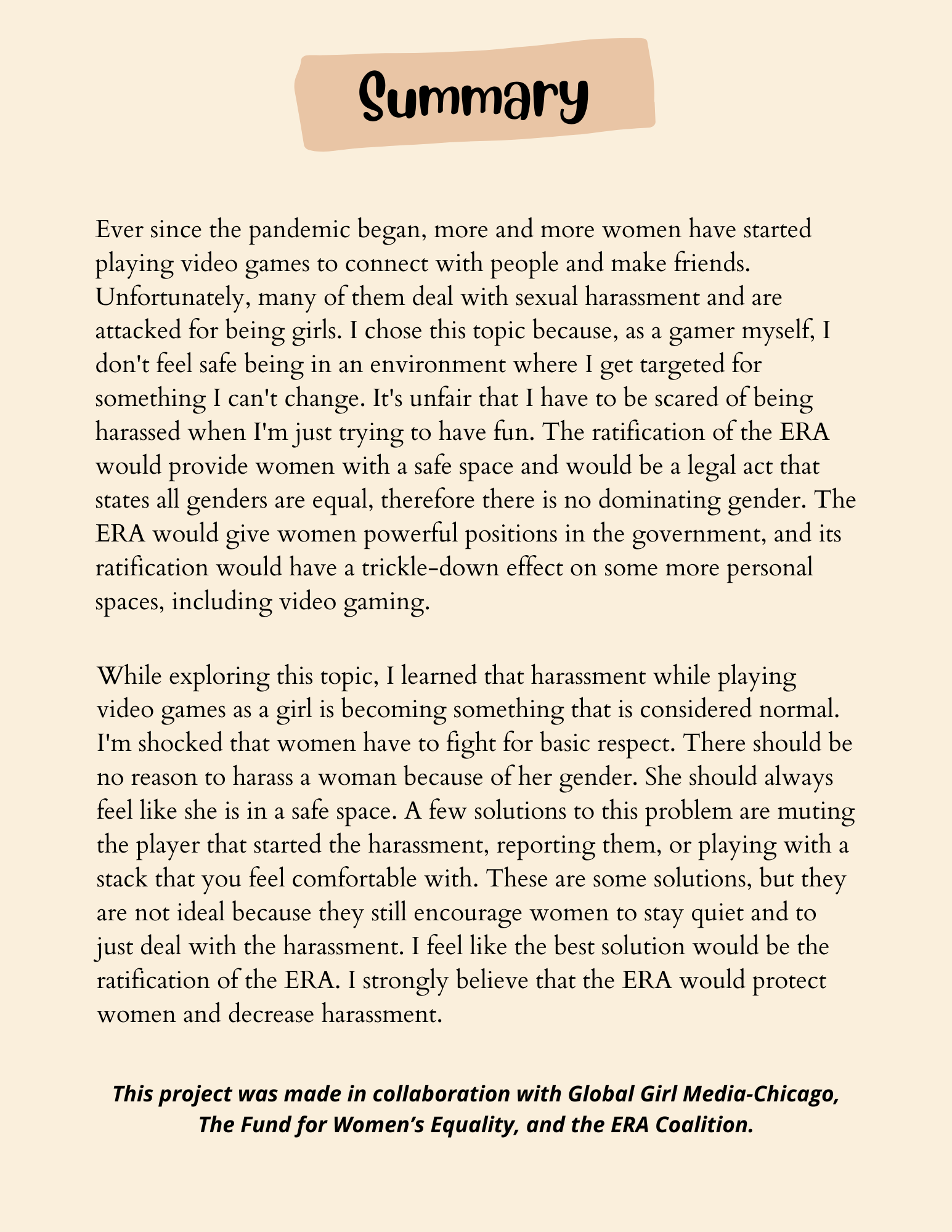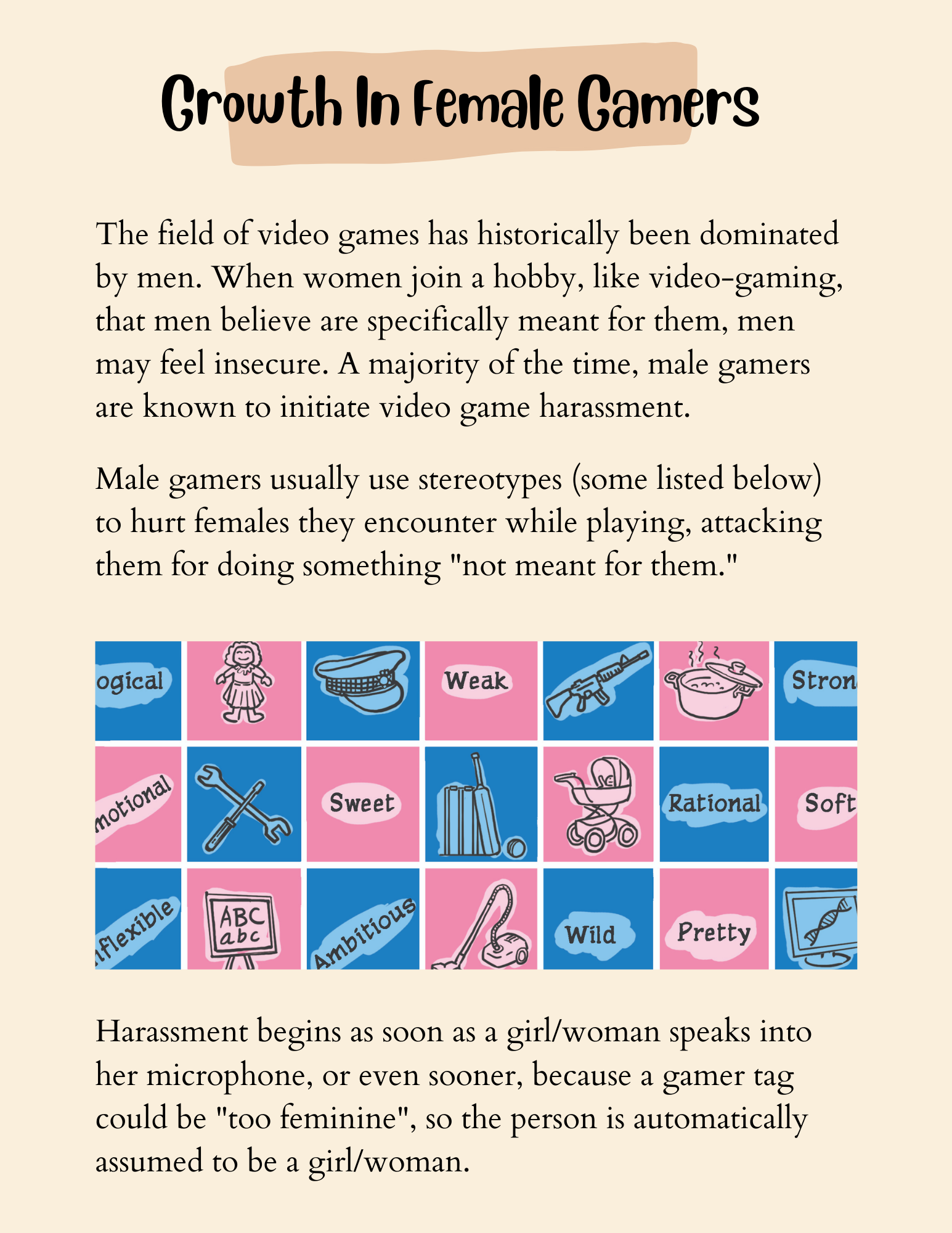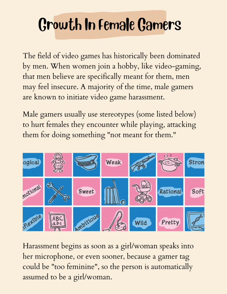 The field of video games has historically been dominated by men. When women join a hobby, like video-gaming, that men believe are specifically meant for them, men may feel insecure. A majority of the time, male gamers are known to initiate video game harassment. Male gamers usually use stereotypes to hurt females they encounter while playing, attacking them for doing something “not meant for them.”
