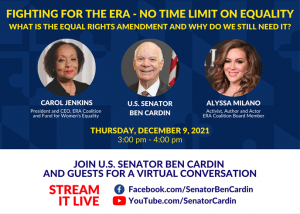 Join Senator Ben Cardin (D-MD), ERA Coalition/FFWE President and CEO Carol Jenkins, and actor, advocate, and ERA Coalition Board Member Alyssa Milano for a discussion on what the ERA is and why we still need it! Discussion is virtual and open to the public, and will be streamed on the Senator's Facebook and YouTube pages.