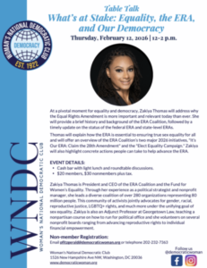 At a pivotal moment for equality and democracy, Zakiya Thomas will address why the Equal Rights Amendment is more important and relevant today than ever. She will provide a brief history and background of the ERA Coalition, followed by a timely update on the status of the federal ERA and state-level ERAs. Thomas will explain how the ERA is essential to ensuring true sex equality for all and will offer an overview of the ERA Coalition’s two major 2026 initiatives, "It’s Our ERA: Claim the…