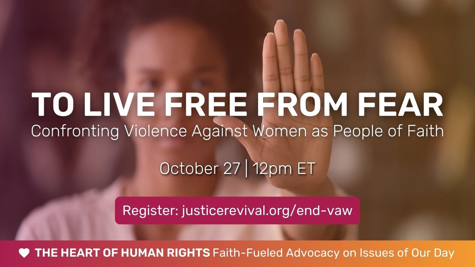 Join Justice Revival, a leading Christian voice for human rights, on October 27th at noon Eastern as we take on the most ubiquitous human rights crisis in the world: violence against women. You’ll hear from leading experts about a crisis of injustice that claims four lives each day but rarely makes headlines in this country. Experts include: